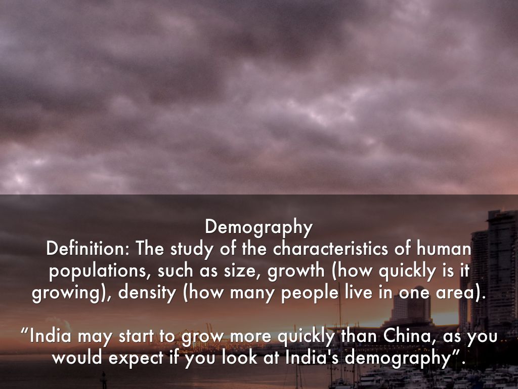 Demography Definition: The study of the characteristics of human populations, such as size, growth (how quickly is it growing), density (how many people live in one area).