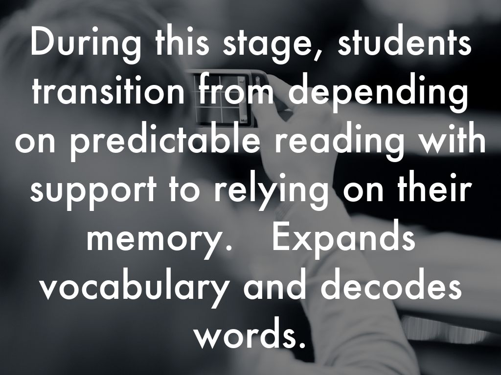 During this stage, students transition from depending on predictable reading with support to relying on their memory. Expands vocabulary and decodes words.