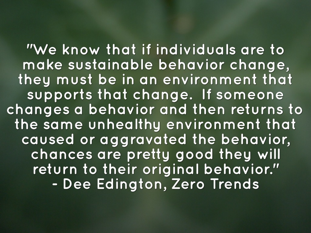 "We know that if individuals are to make sustainable behavior change, they must be in an environment that supports that change. If someone changes a behavior and then returns to the same unhealthy environment that caused or aggravated the behavior, chances are pretty good they will return to their original behavior." - Dee Edington, Zero Trends