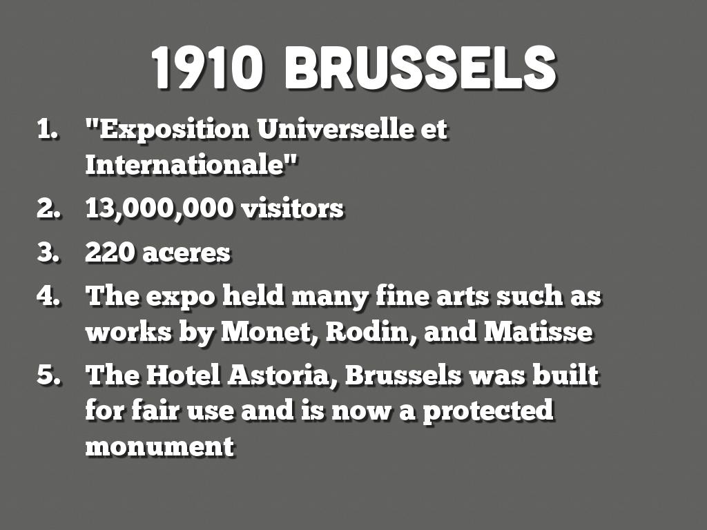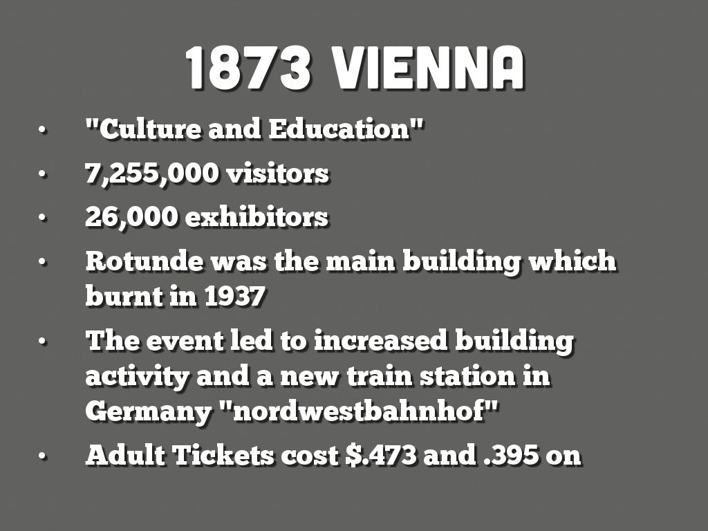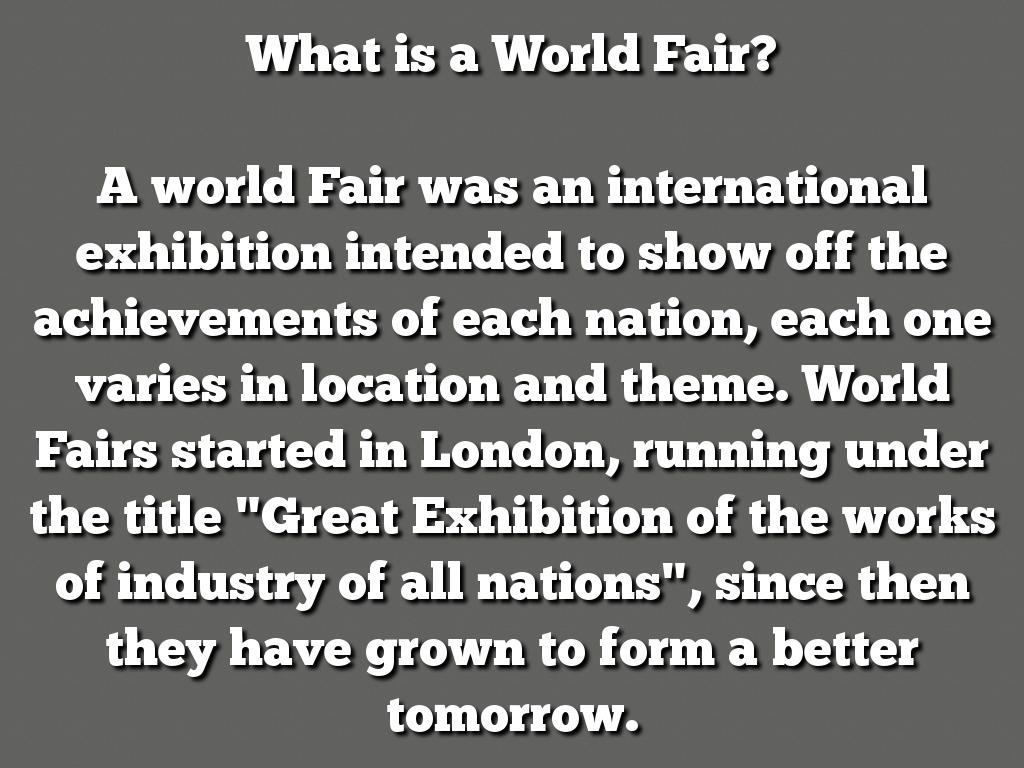 A world Fair was an international exhibition intended to show off the achievements of each nation, each one varies in location and theme. World Fairs started in London, running under the title "Great Exhibition of the works of industry of all nations", since then they have grown to form a better tomorrow.