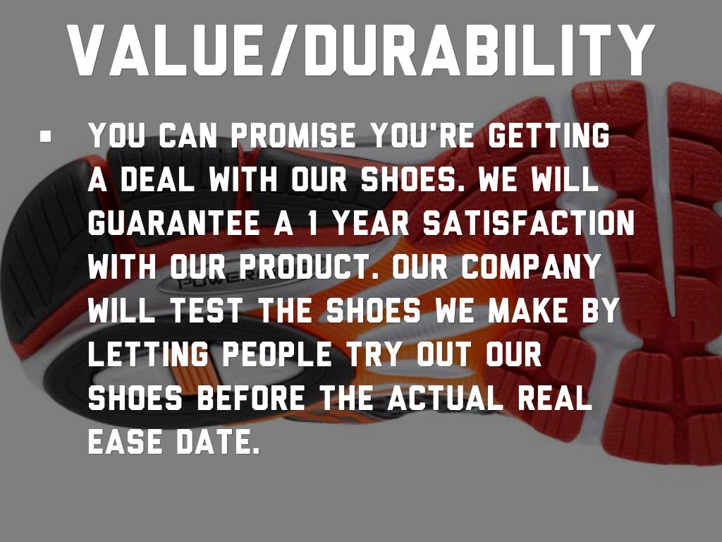 You can promise you're getting a deal with our shoes. We will guarantee a 1 year satisfaction with our product. Our company will test the shoes we make by letting people try out our shoes before the actual real ease date.