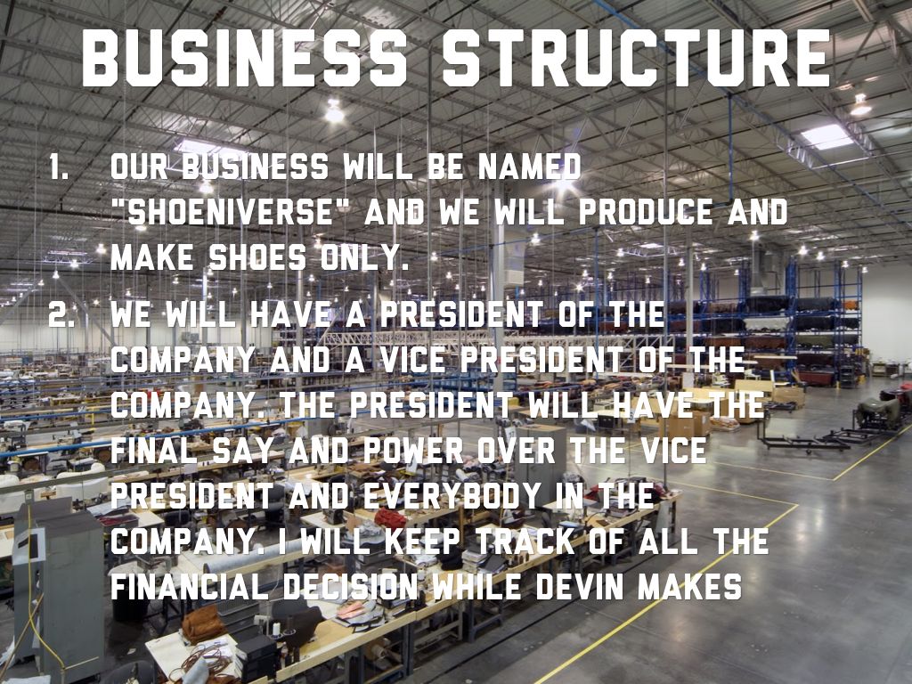 We will have a president of the company and a Vice President of the company. The president will have the final say and power over the Vice President and everybody in the company. I will keep track of all the financial decision while Devin makes all the marketing decisions.