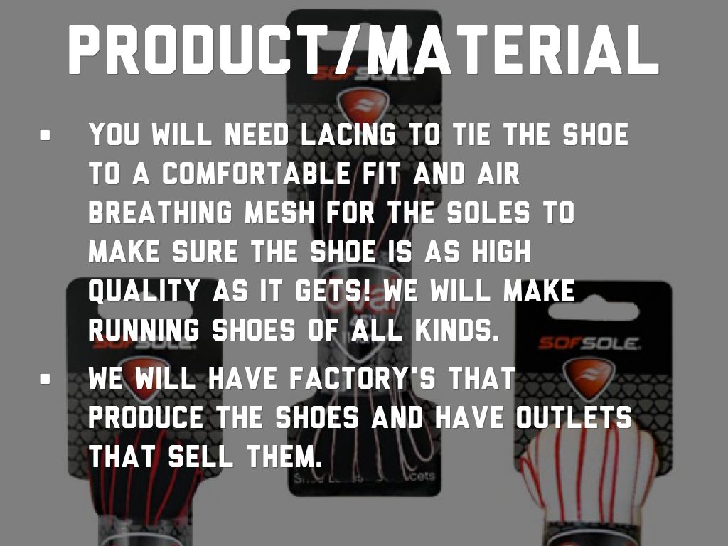 You will need lacing to tie the shoe to a comfortable fit and air breathing mesh for the soles to make sure the shoe is as high quality as it gets! We will make running shoes of all kinds.