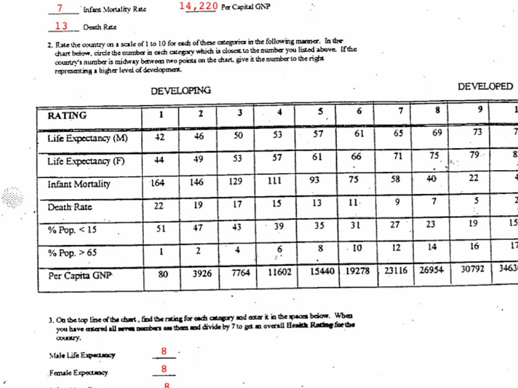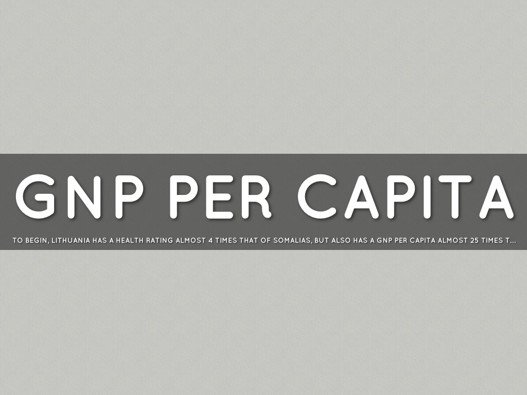 TO BEGIN, LITHUANIA HAS A HEALTH RATING ALMOST 4 TIMES THAT OF SOMALIAS, BUT ALSO HAS A GNP PER CAPITA ALMOST 25 TIMES THAT OF SOMALIA