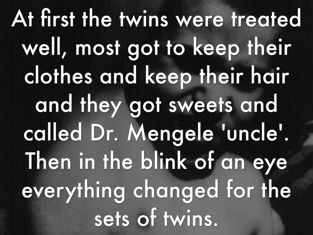 At first the twins were treated well, most got to keep their clothes and keep their hair and they got sweets and called Dr. Mengele 'uncle'. Then in the blink of an eye everything changed for the sets of twins.