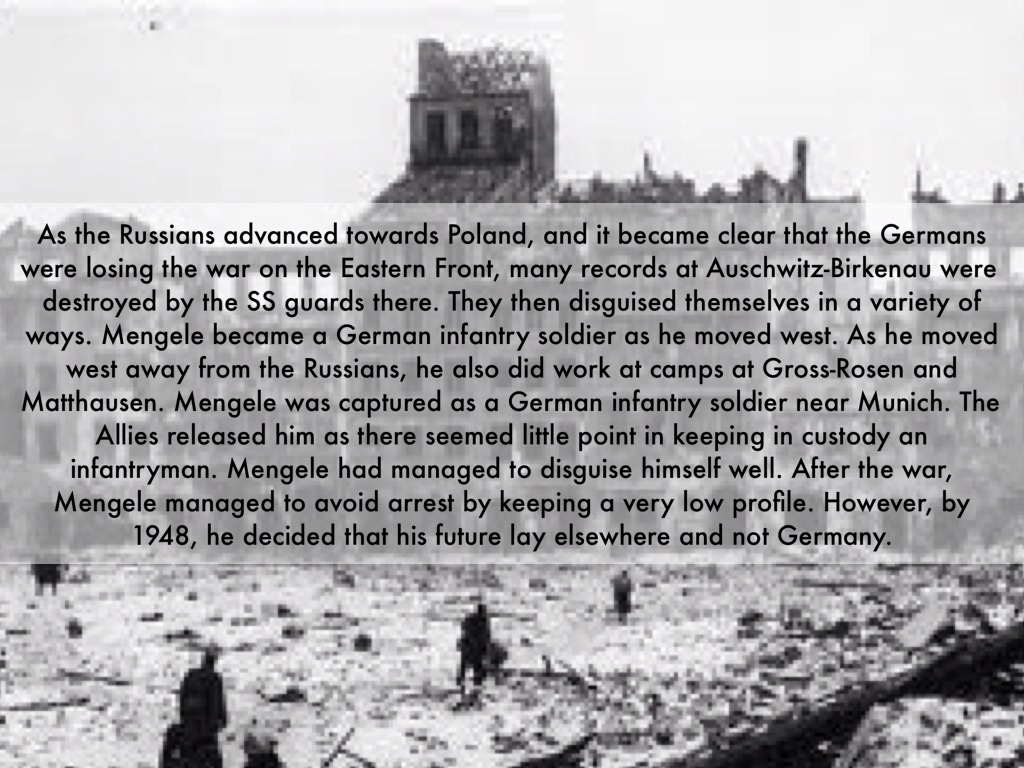 As the Russians advanced towards Poland, and it became clear that the Germans were losing the war on the Eastern Front, many records at Auschwitz-Birkenau were destroyed by the SS guards there. They then disguised themselves in a variety of ways. Mengele became a German infantry soldier as he moved west. As he moved west away from the Russians, he also did work at camps at Gross-Rosen and Matthausen. Mengele was captured as a German infantry soldier near Munich. The Allies released him as there seemed little point in keeping in custody an infantryman. Mengele had managed to disguise himself well. After the war, Mengele managed to avoid arrest by keeping a very low profile. However, by 1948, he decided that his future lay elsewhere and not Germany.