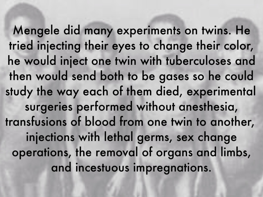 Mengele did many experiments on twins. He tried injecting their eyes to change their color, he would inject one twin with tuberculoses and then would send both to be gases so he could study the way each of them died, experimental surgeries performed without anesthesia, transfusions of blood from one twin to another, injections with lethal germs, sex change operations, the removal of organs and limbs, and incestuous impregnations.