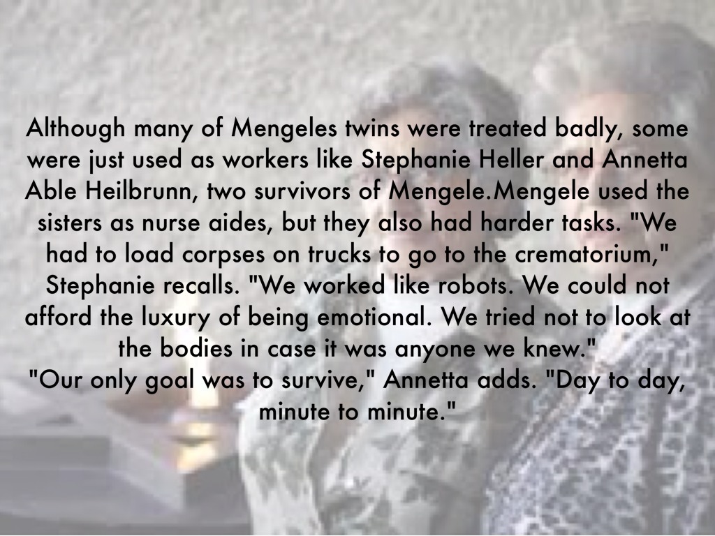 Although many of Mengeles twins were treated badly, some were just used as workers like Stephanie Heller and Annetta Able Heilbrunn, two survivors of Mengele.Mengele used the sisters as nurse aides, but they also had harder tasks. "We had to load corpses on trucks to go to the crematorium," Stephanie recalls. "We worked like robots. We could not afford the luxury of being emotional. We tried not to look at the bodies in case it was anyone we knew."