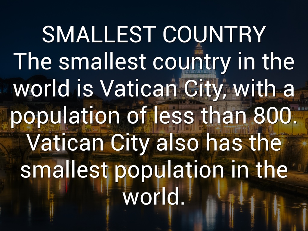SMALLEST COUNTRY The smallest country in the world is Vatican City, with a population of less than 800. Vatican City also has the smallest population in the world.