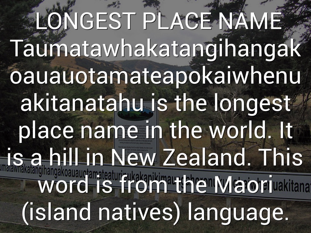 LONGEST PLACE NAME Taumatawhakatangihangakoauauotamateapokaiwhenuakitanatahu is the longest place name in the world. It is a hill in New Zealand. This word is from the Maori (island natives) language.
