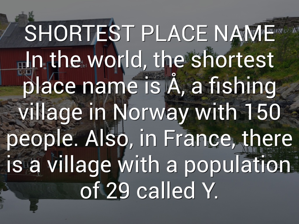 SHORTEST PLACE NAME In the world, the shortest place name is Å, a fishing village in Norway with 150 people. Also, in France, there is a village with a population of 29 called Y.