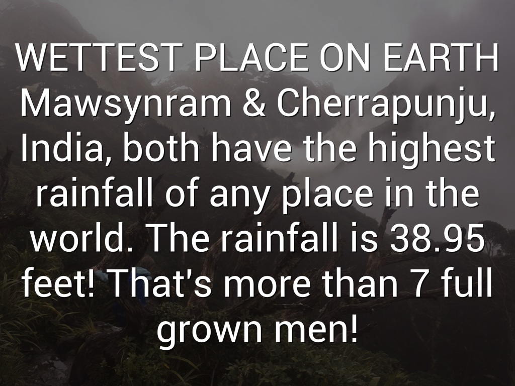 WETTEST PLACE ON EARTH Mawsynram & Cherrapunju, India, both have the highest rainfall of any place in the world. The rainfall is 38.95 feet! That's more than 7 full grown men!