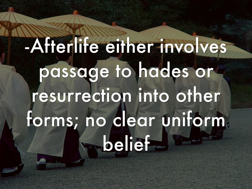-Afterlife either involves passage to hades or resurrection into other forms; no clear uniform belief