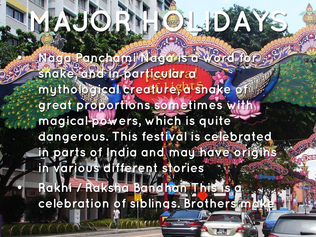 Rakhi / Raksha Bandhan This is a celebration of siblings. Brothers make promises to protect their sisters and the sisters ritually tie on their wrists sacred red thread bracelets.