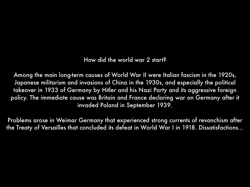 Among the main long-term causes of World War II were Italian fascism in the 1920s, Japanese militarism and invasions of China in the 1930s, and especially the political takeover in 1933 of Germany by Hitler and his Nazi Party and its aggressive foreign policy. The immediate cause was Britain and France declaring war on Germany after it invaded Poland in September 1939.