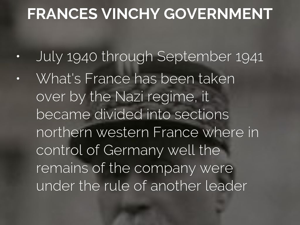 What's France has been taken over by the Nazi regime, it became divided into sections northern western France where in control of Germany well the remains of the company were under the rule of another leader