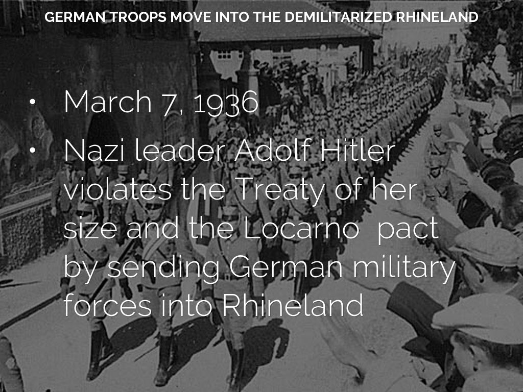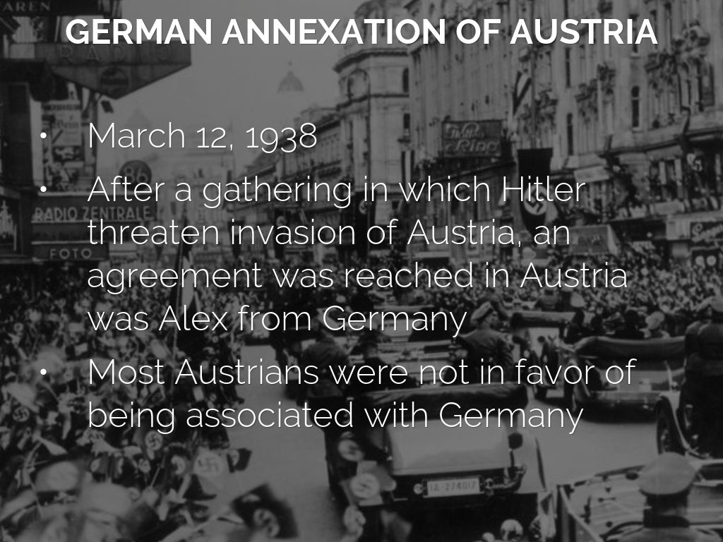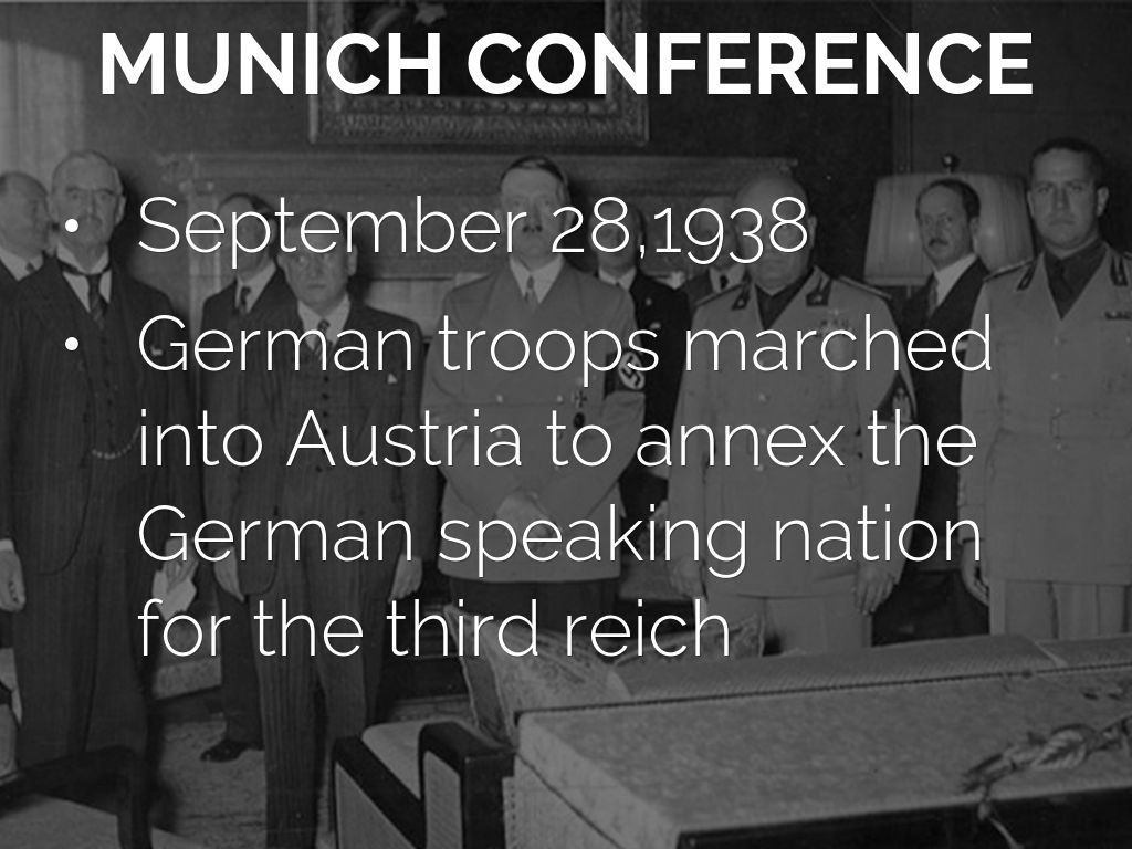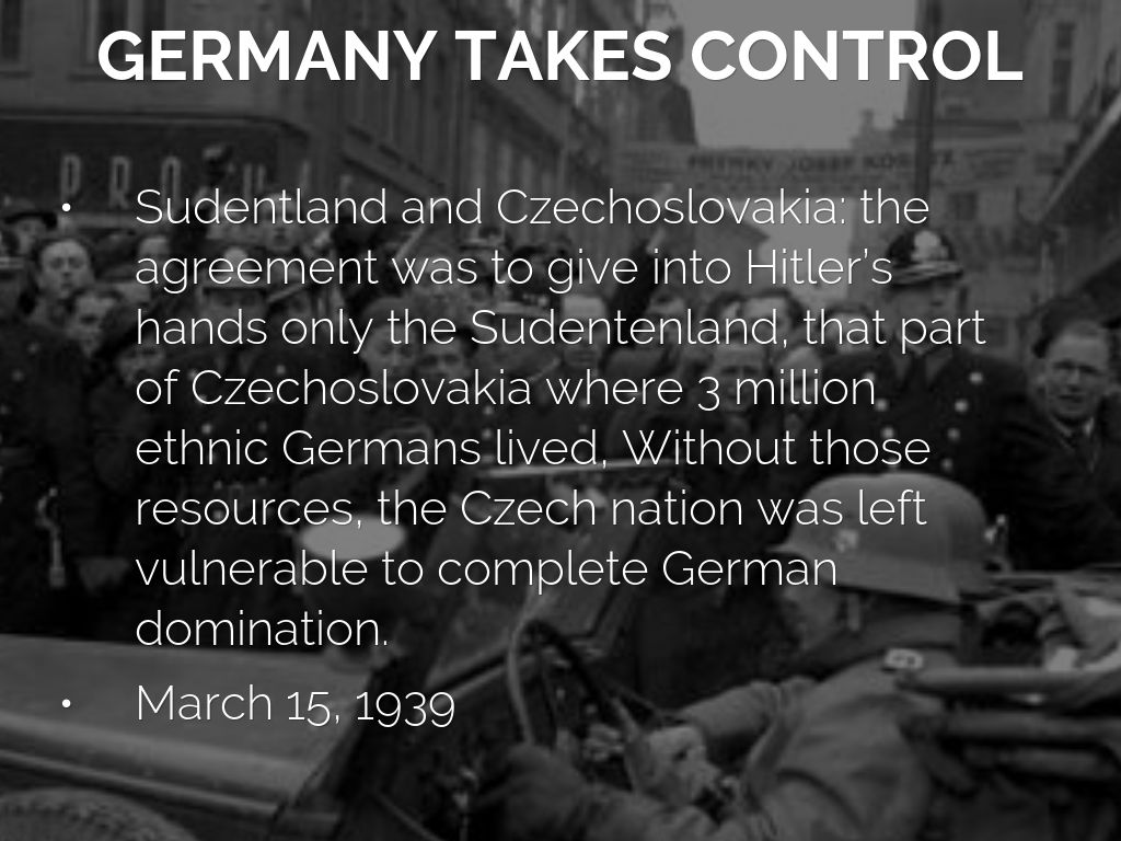 Sudentland and Czechoslovakia: the agreement was to give into Hitler’s hands only the Sudentenland, that part of Czechoslovakia where 3 million ethnic Germans lived, Without those resources, the Czech nation was left vulnerable to complete German domination.