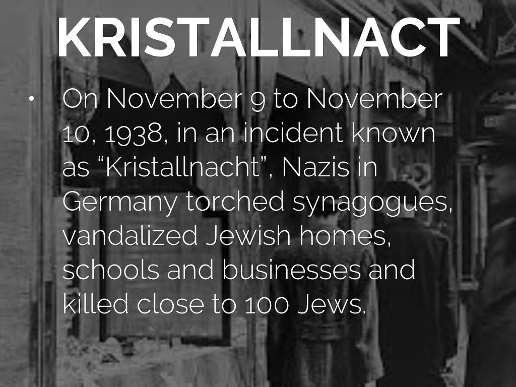 On November 9 to November 10, 1938, in an incident known as “Kristallnacht”, Nazis in Germany torched synagogues, vandalized Jewish homes, schools and businesses and killed close to 100 Jews.