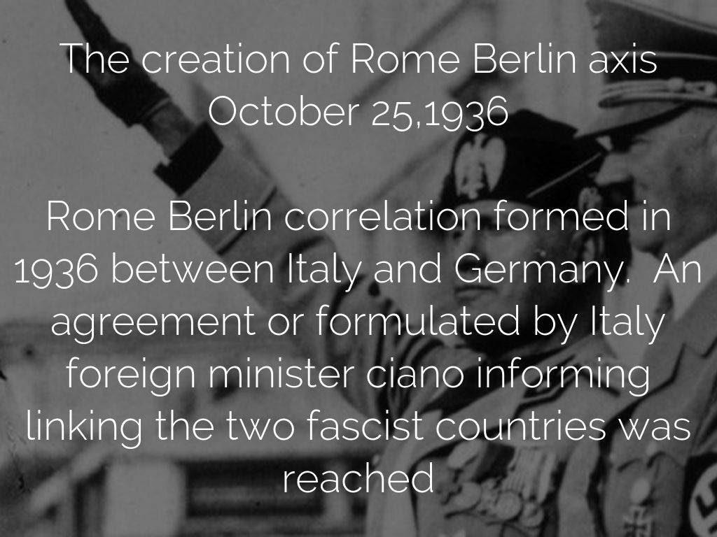 Rome Berlin correlation formed in 1936 between Italy and Germany. An agreement or formulated by Italy foreign minister ciano informing linking the two fascist countries was reached