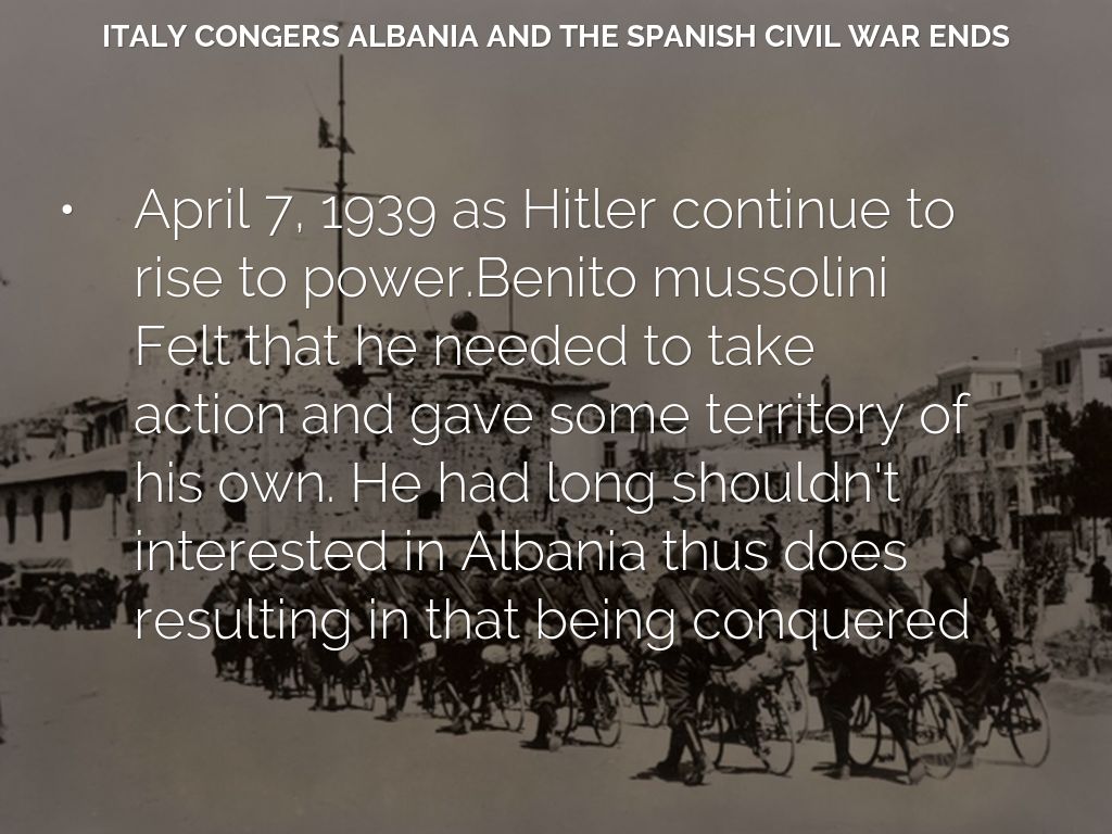 April 7, 1939 as Hitler continue to rise to power.Benito mussolini Felt that he needed to take action and gave some territory of his own. He had long shouldn't interested in Albania thus does resulting in that being conquered