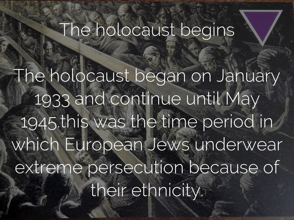 The holocaust began on January 1933 and continue until May 1945.this was the time period in which European Jews underwear extreme persecution because of their ethnicity.