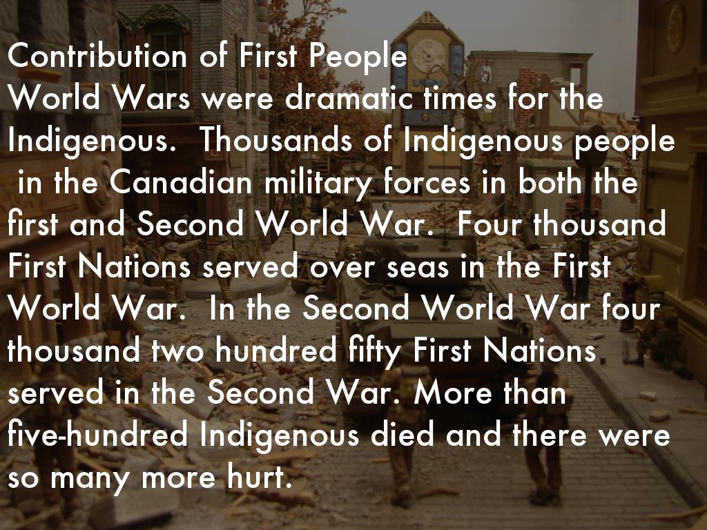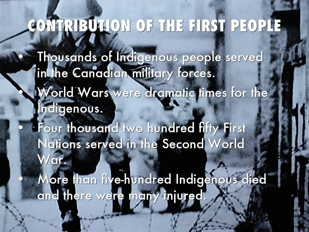 Contribution of First People World Wars were dramatic times for the Indigenous. Thousands of Indigenous people in the Canadian military forces in both the first and Second World War. Four thousand First Nations served over seas in the First World War. In the Second World War four thousand two hundred fifty First Nations served in the Second War. More than five-hundred Indigenous died and there were so many more hurt.