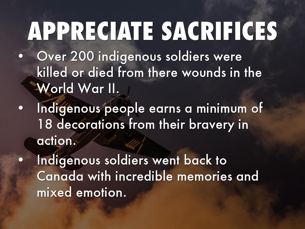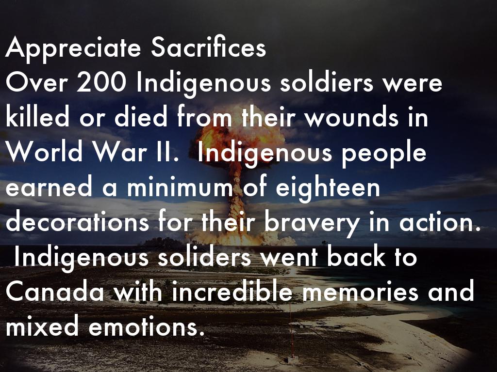 Appreciate Sacrifices Over 200 Indigenous soldiers were killed or died from their wounds in World War II. Indigenous people earned a minimum of eighteen decorations for their bravery in action. Indigenous soliders went back to Canada with incredible memories and mixed emotions.