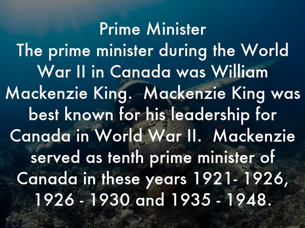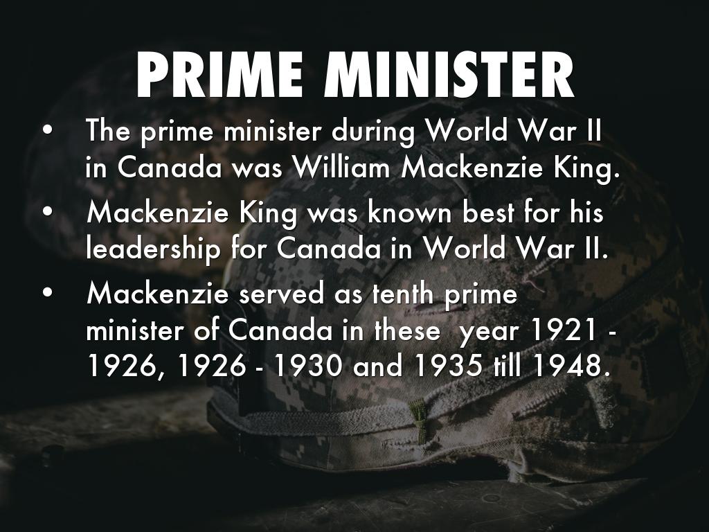 Prime Minister The prime minister during the World War II in Canada was William Mackenzie King. Mackenzie King was best known for his leadership for Canada in World War II. Mackenzie served as tenth prime minister of Canada in these years 1921- 1926, 1926 - 1930 and 1935 - 1948.