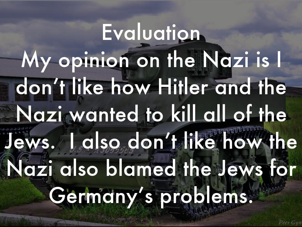Evaluation My opinion on the Nazi is I don’t like how Hitler and the Nazi wanted to kill all of the Jews. I also don’t like how the Nazi also blamed the Jews for Germany’s problems.