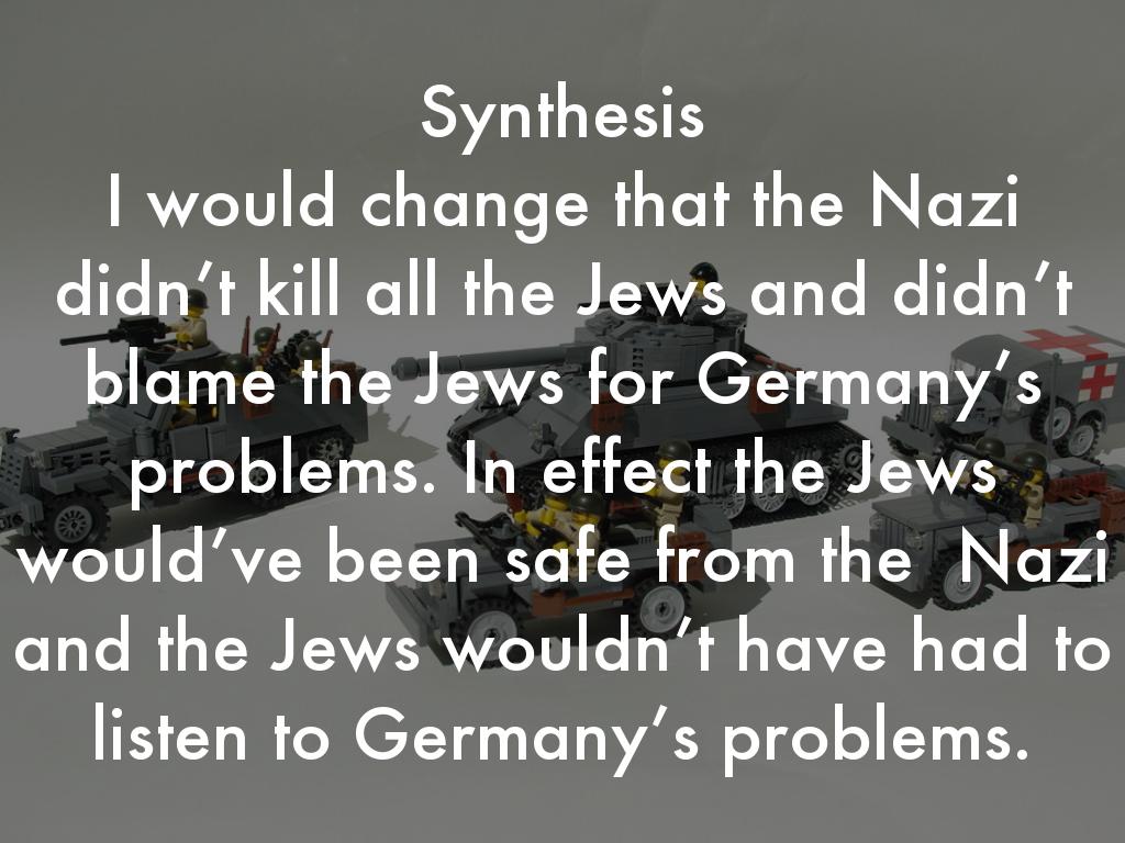 Synthesis I would change that the Nazi didn’t kill all the Jews and didn’t blame the Jews for Germany’s problems. In effect the Jews would’ve been safe from the Nazi and the Jews wouldn’t have had to listen to Germany’s problems.
