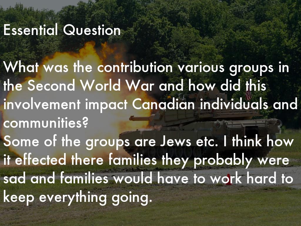 What was the contribution various groups in the Second World War and how did this involvement impact Canadian individuals and communities? Some of the groups are Jews etc. I think how it effected there families they probably were sad and families would have to work hard to keep everything going.