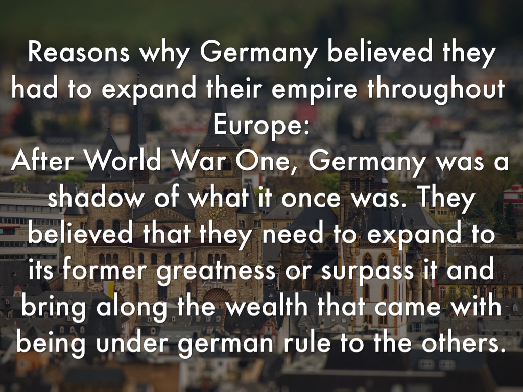 After World War One, Germany was a shadow of what it once was. They believed that they need to expand to its former greatness or surpass it and bring along the wealth that came with being under german rule to the others.