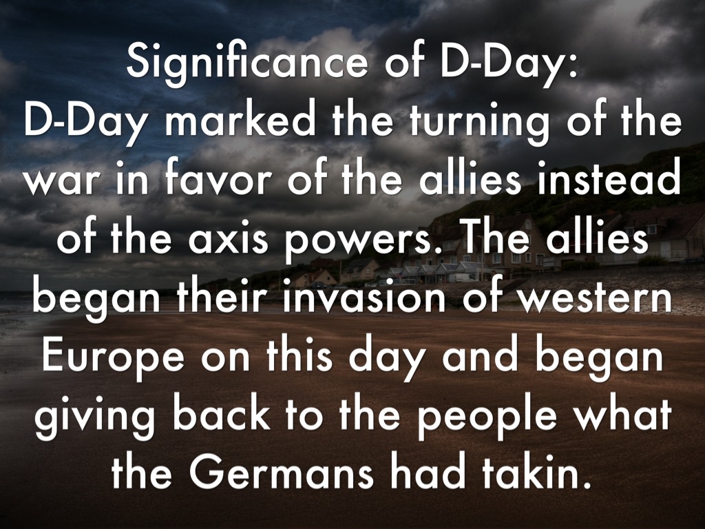 D-Day marked the turning of the war in favor of the allies instead of the axis powers. The allies began their invasion of western Europe on this day and began giving back to the people what the Germans had takin.
