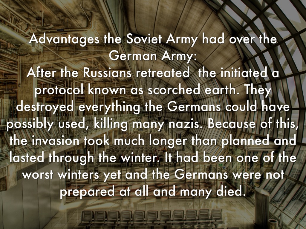 After the Russians retreated the initiated a protocol known as scorched earth. They destroyed everything the Germans could have possibly used, killing many nazis. Because of this, the invasion took much longer than planned and lasted through the winter. It had been one of the worst winters yet and the Germans were not prepared at all and many died.