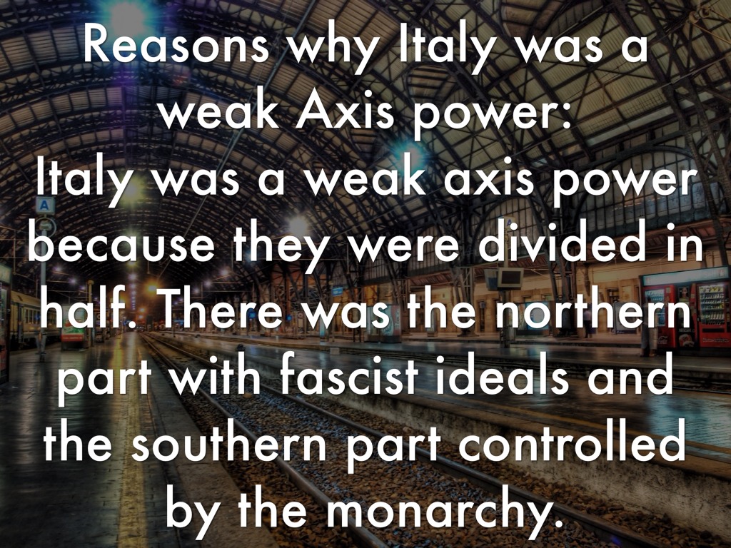 Italy was a weak axis power because they were divided in half. There was the northern part with fascist ideals and the southern part controlled by the monarchy.