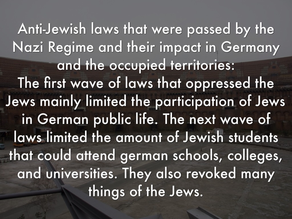 Anti-Jewish laws that were passed by the Nazi Regime and their impact in Germany and the occupied territories: