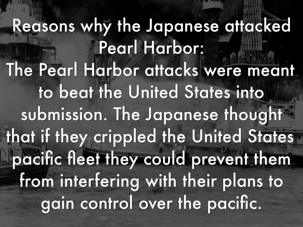 The Pearl Harbor attacks were meant to beat the United States into submission. The Japanese thought that if they crippled the United States pacific fleet they could prevent them from interfering with their plans to gain control over the pacific.