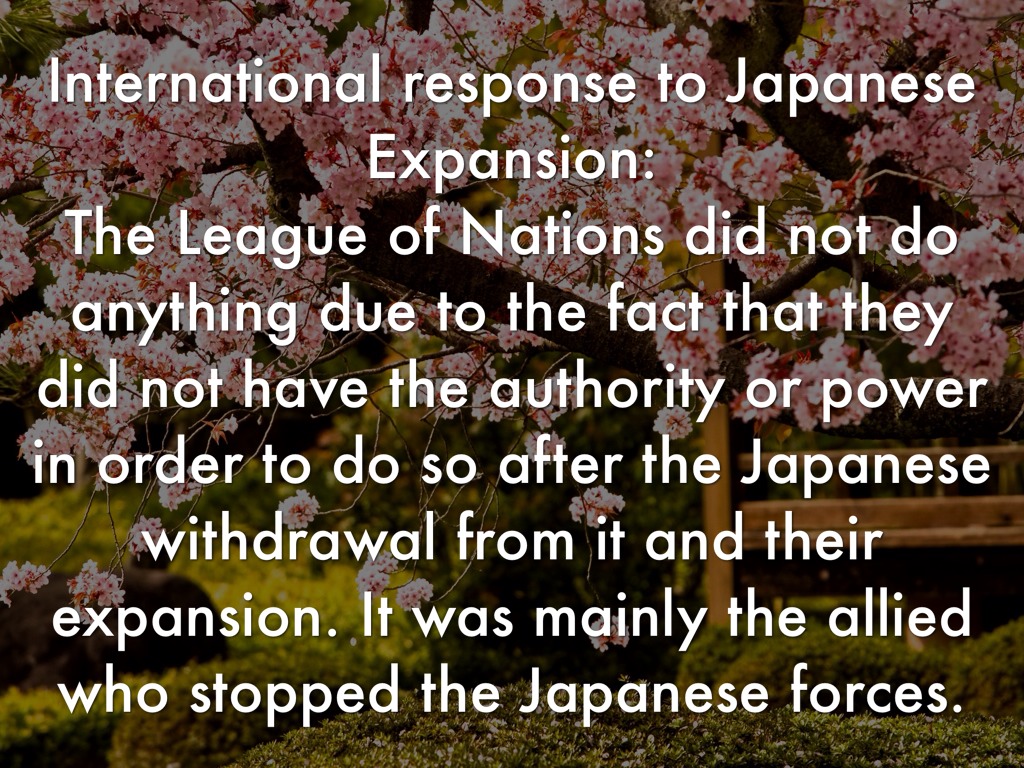 The League of Nations did not do anything due to the fact that they did not have the authority or power in order to do so after the Japanese withdrawal from it and their expansion. It was mainly the allied who stopped the Japanese forces.