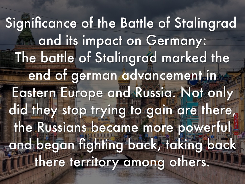 The battle of Stalingrad marked the end of german advancement in Eastern Europe and Russia. Not only did they stop trying to gain are there, the Russians became more powerful and began fighting back, taking back there territory among others.