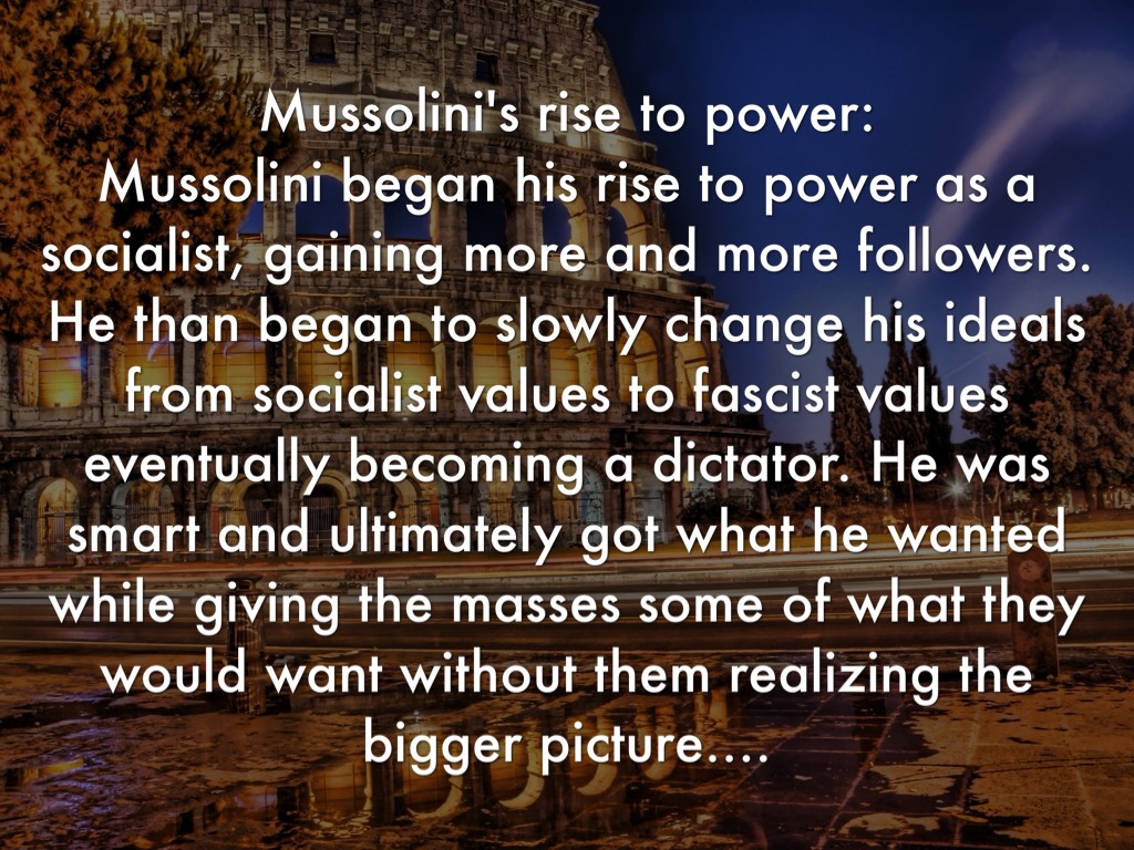 Mussolini began his rise to power as a socialist, gaining more and more followers. He than began to slowly change his ideals from socialist values to fascist values eventually becoming a dictator. He was smart and ultimately got what he wanted while giving the masses some of what they would want without them realizing the bigger picture.