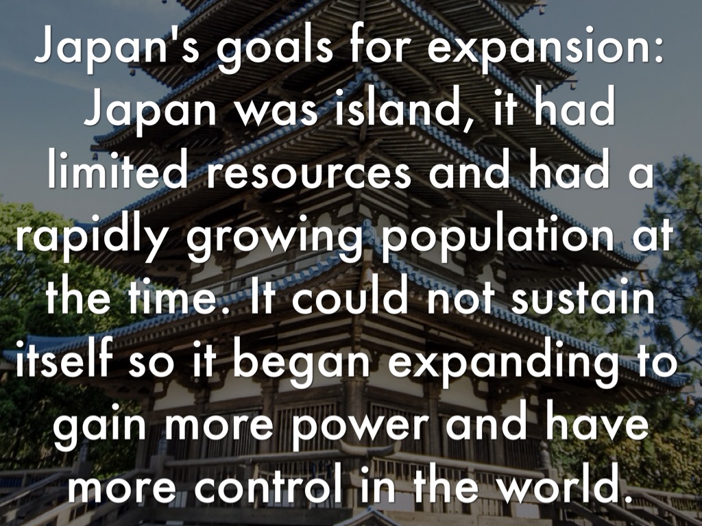 Japan was island, it had limited resources and had a rapidly growing population at the time. It could not sustain itself so it began expanding to gain more power and have more control in the world.