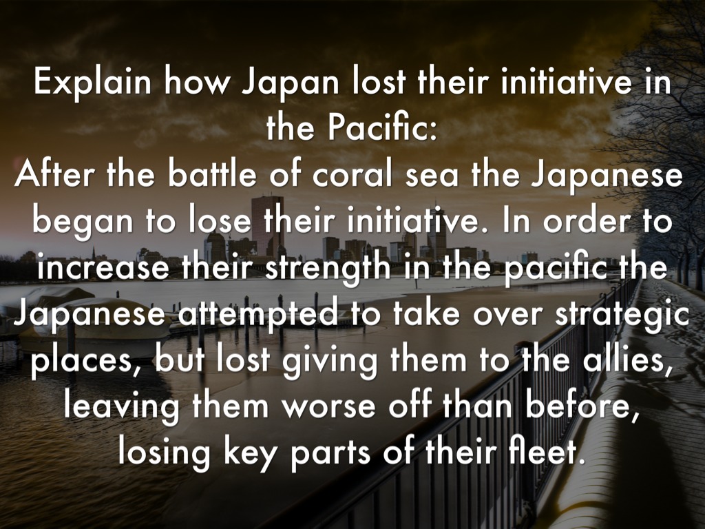 After the battle of coral sea the Japanese began to lose their initiative. In order to increase their strength in the pacific the Japanese attempted to take over strategic places, but lost giving them to the allies, leaving them worse off than before, losing key parts of their fleet.