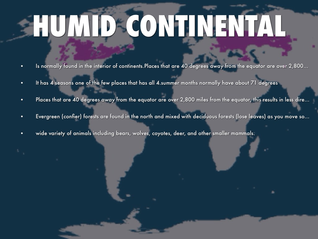 Is normally found in the interior of continents.Places that are 40 degrees away from the equator are over 2,800 miles from the equator, this results in less direct sunlight and less warmth.