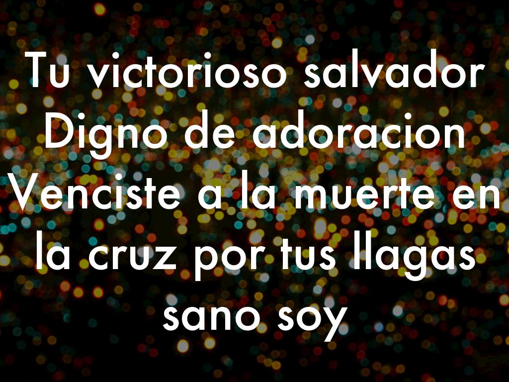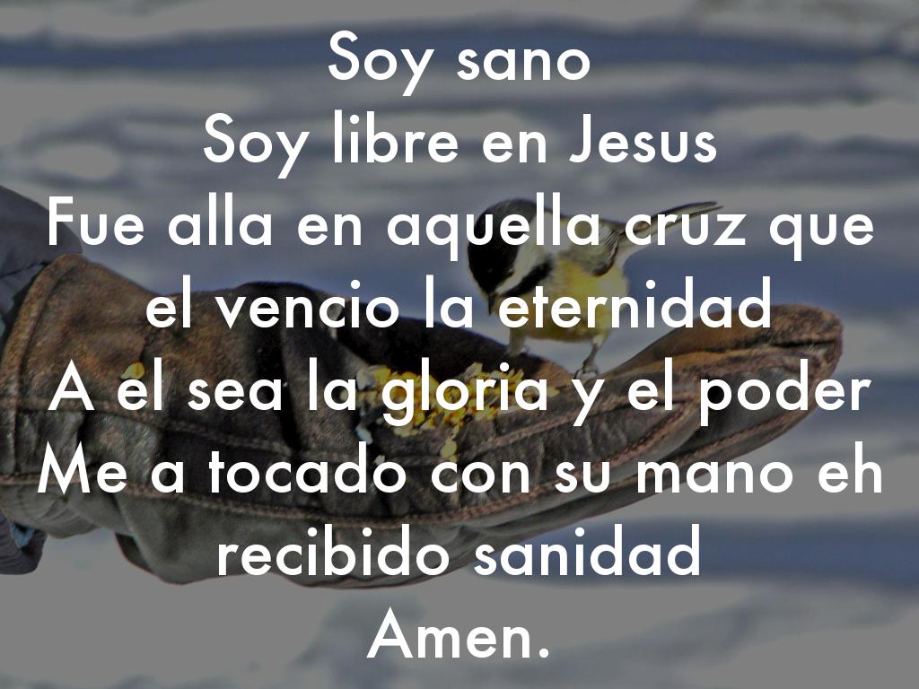 Soy sano Soy libre en Jesus Fue alla en aquella cruz que el vencio la eternidad A el sea la gloria y el poder Me a tocado con su mano eh recibido sanidad Amen.