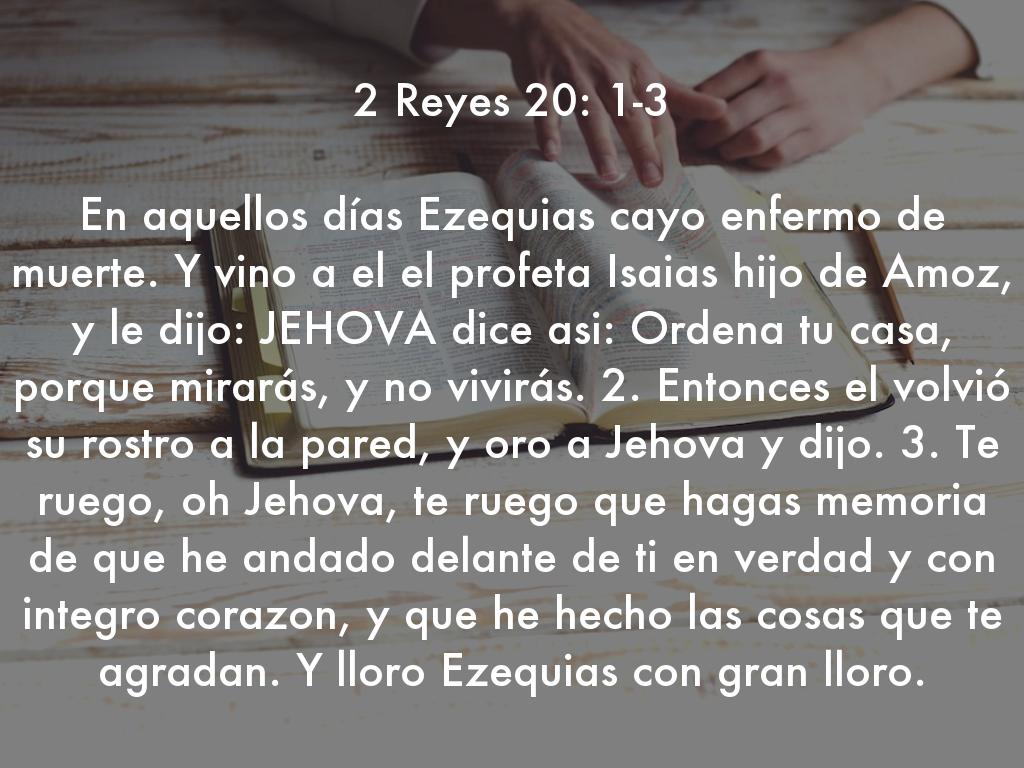 En aquellos días Ezequias cayo enfermo de muerte. Y vino a el el profeta Isaias hijo de Amoz, y le dijo: JEHOVA dice asi: Ordena tu casa, porque mirarás, y no vivirás. 2. Entonces el volvió su rostro a la pared, y oro a Jehova y dijo. 3. Te ruego, oh Jehova, te ruego que hagas memoria de que he andado delante de ti en verdad y con integro corazon, y que he hecho las cosas que te agradan. Y lloro Ezequias con gran lloro.