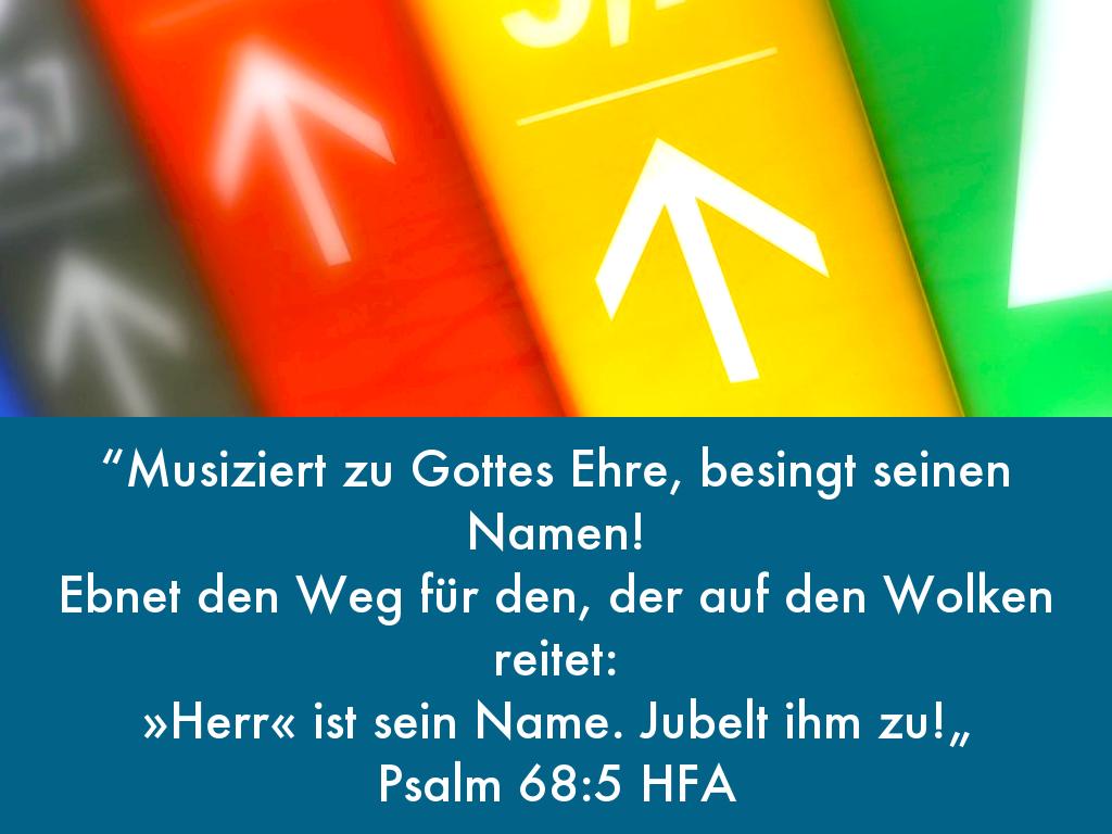 “Musiziert zu Gottes Ehre, besingt seinen Namen! Ebnet den Weg für den, der auf den Wolken reitet: »Herr« ist sein Name. Jubelt ihm zu!„ Psalm 68:5 HFA