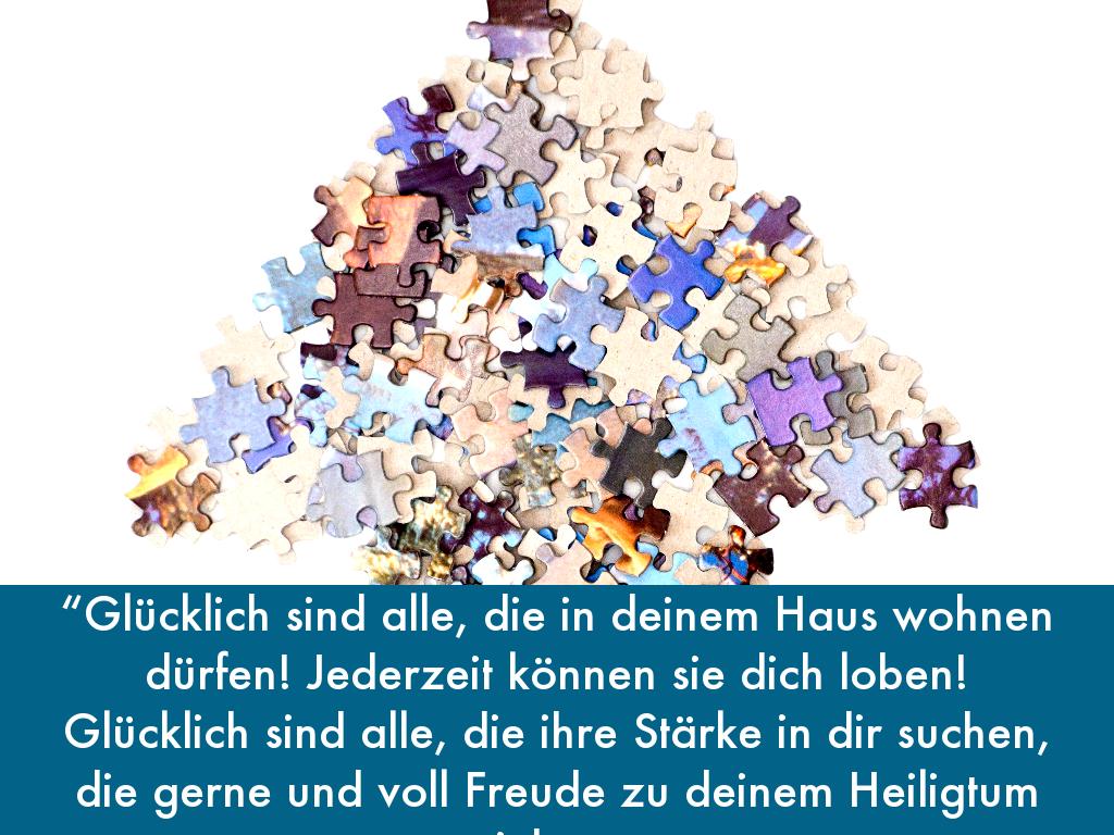 “Glücklich sind alle, die in deinem Haus wohnen dürfen! Jederzeit können sie dich loben! Glücklich sind alle, die ihre Stärke in dir suchen, die gerne und voll Freude zu deinem Heiligtum ziehen.„ Psalm 84:5-6 HFA