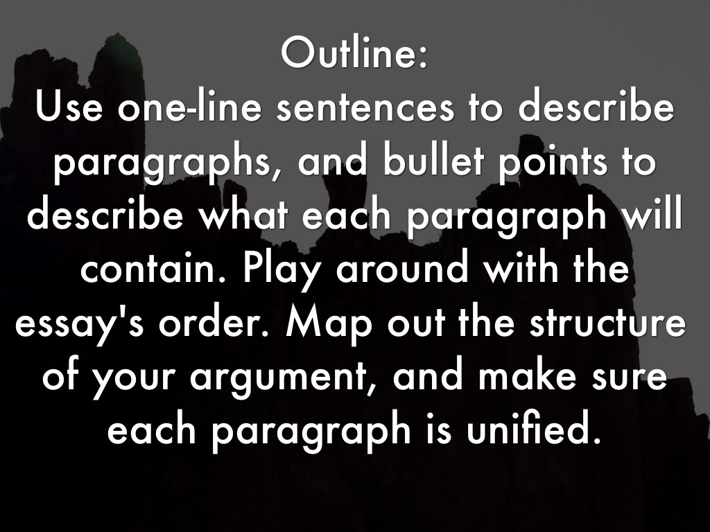 Outline: Use one-line sentences to describe paragraphs, and bullet points to describe what each paragraph will contain. Play around with the essay's order. Map out the structure of your argument, and make sure each paragraph is unified.