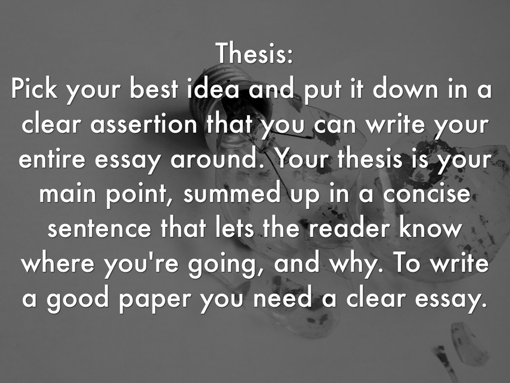 Thesis: Pick your best idea and put it down in a clear assertion that you can write your entire essay around. Your thesis is your main point, summed up in a concise sentence that lets the reader know where you're going, and why. To write a good paper you need a clear essay.