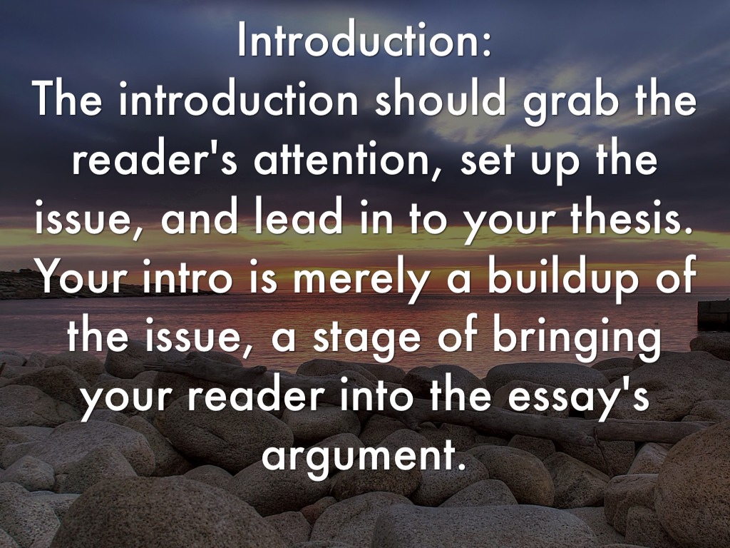 Introduction: The introduction should grab the reader's attention, set up the issue, and lead in to your thesis. Your intro is merely a buildup of the issue, a stage of bringing your reader into the essay's argument.